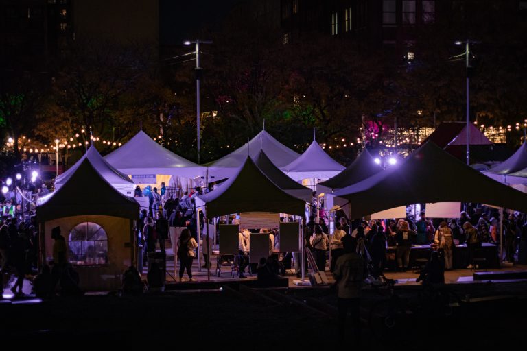 La vigile de solidarité a débuté a 18h30 à Émilie-Gamelin avec des discussions dans une grande tente sensibilisante, plus d’une vingtaine de kiosques d’organismes montréalais, de la nourriture et du café et de nombreuses prestations musicales.
